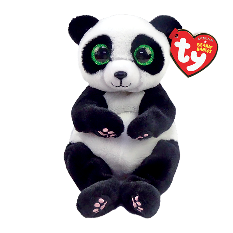 Petite peluche panda en matière très douce, aux yeux scintillants, assis dans une pose attentive, ses pattes brodées sont prêtes à vous étreindre, à offrir à tout âge.