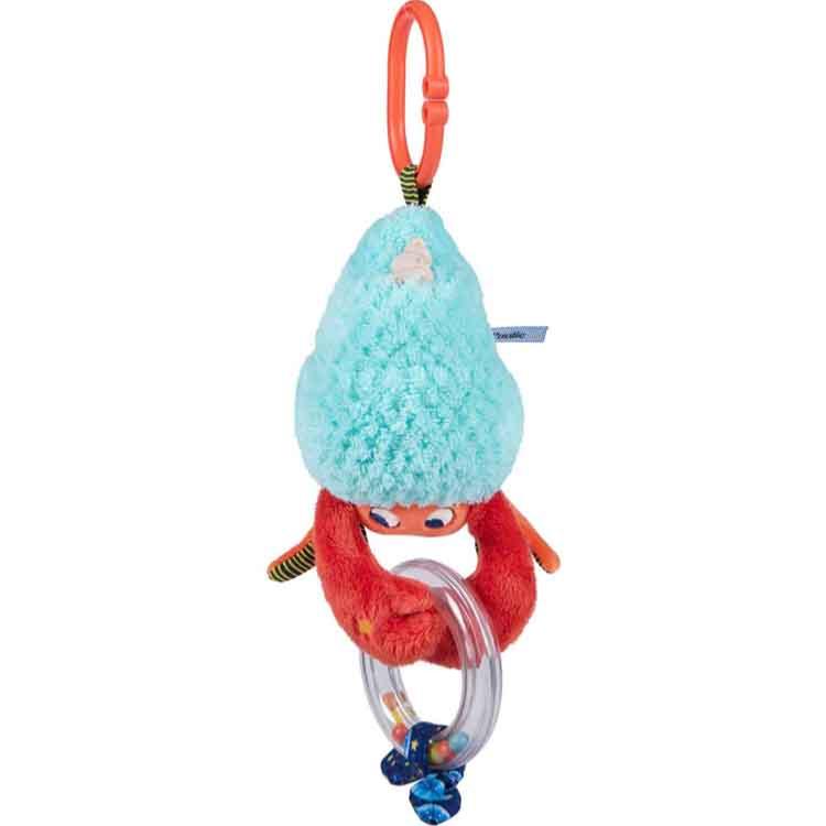 Voici un drôle de Bernard l'Hermite aux motifs colorés qui propose plein d'activités : anneau à billes, étiquettes à attraper, clochette... Il s'accroche partout et peut être complété par d'autres petites activités nomades de la collection. À offrir à partir de 3/4 mois et plus.