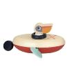 Un pélican en bois dans son canoé vogue dans la baignoire... Il suffit de tirer sur la pastille qui relie la cordelette actionnant ainsi les deux rames du bateau... Un jouet simple particulièrement bien apprécié par les enfants à partir de 2 ans et plus.