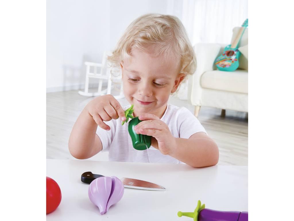Jouets d'imitation, les enfants peuvent équeuter les légumes et les découper avec le faux couteau. Pour jouer à la cuisine ou à la marchande, à offrir à partir de trois ans et plus.