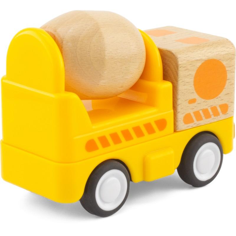 Dans la gamme Routoudou, voici le mini camion toupie, véhicule de chantier robuste et amusant, fabriqué avec des matériaux de qualité, bois et plastique durable, il roule en le poussant ou à rétro friction, les pneus sont munis de caoutchouc et en appuyant sur le véhicule, les phares s'allument et trois sons différents de chantier se déclenchent.