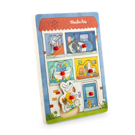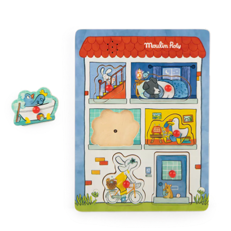 Puzzle sonore en bois joliment décoré pour découvrir les sons du quotidien : sonnette, téléphone, etc...