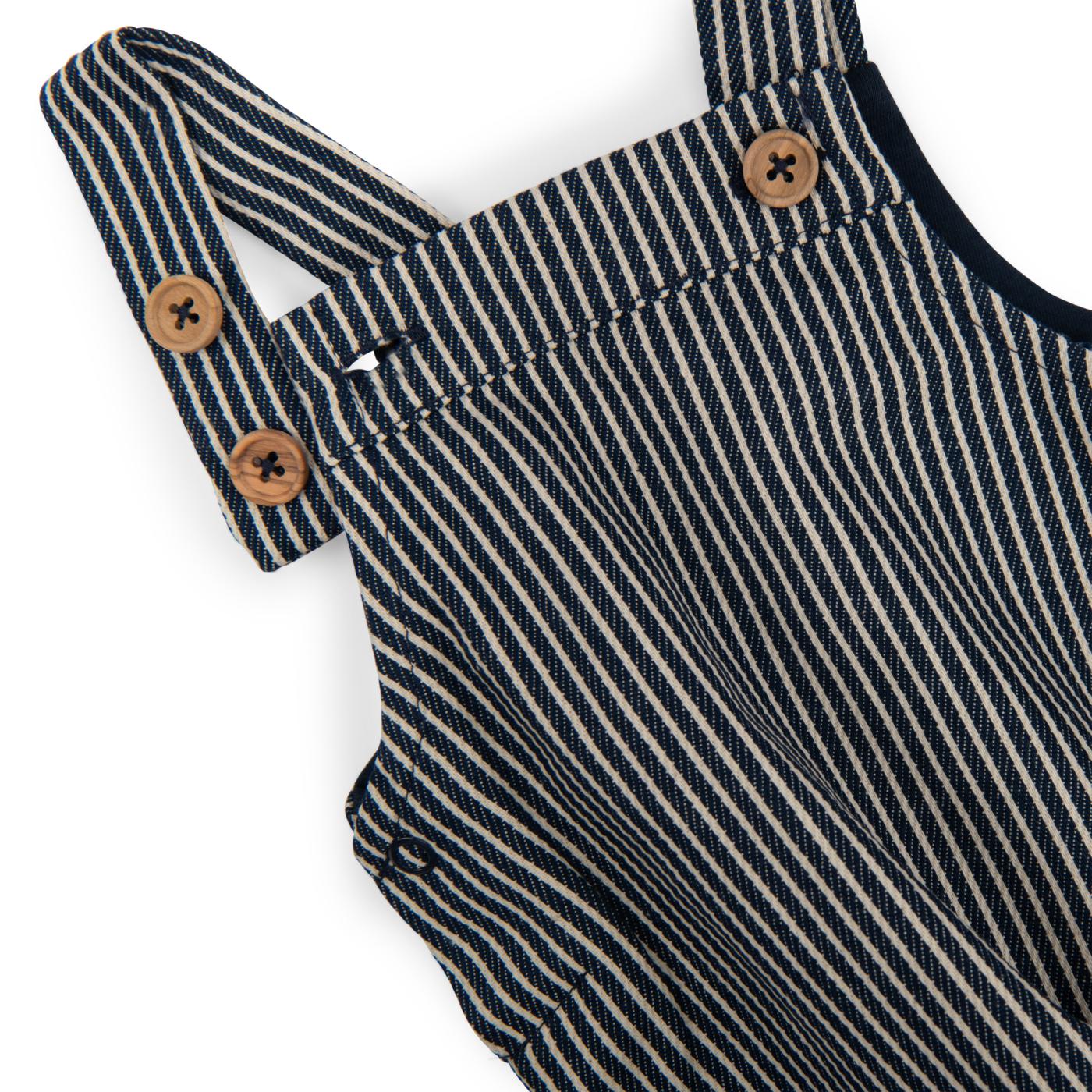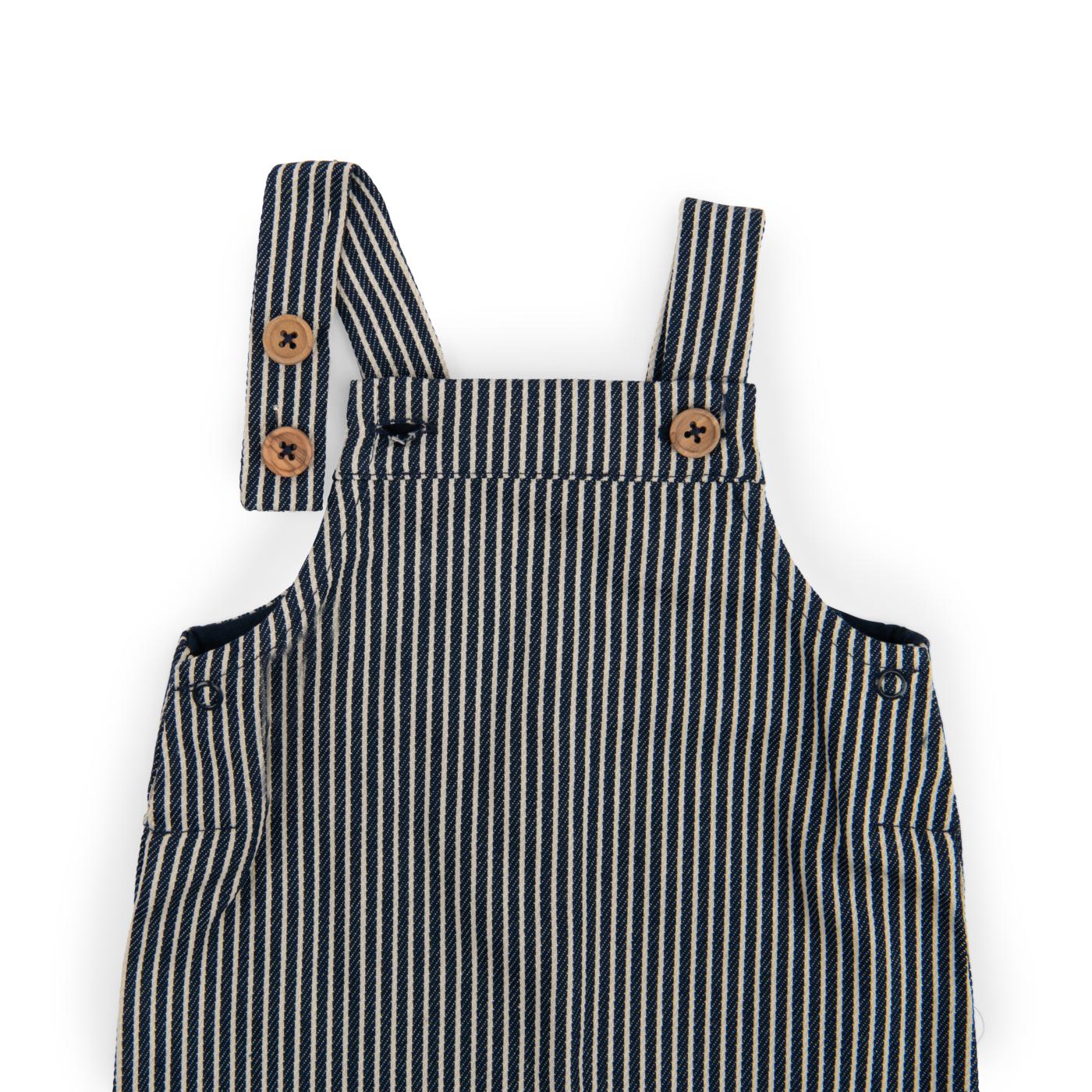 Salopette en coton rayé s'ouvrant à l'entre jambe par boutons pressions, les bretelles sont réglables grâce à deux petits boutons bois. Vêtement idéal pour le bébé couché.