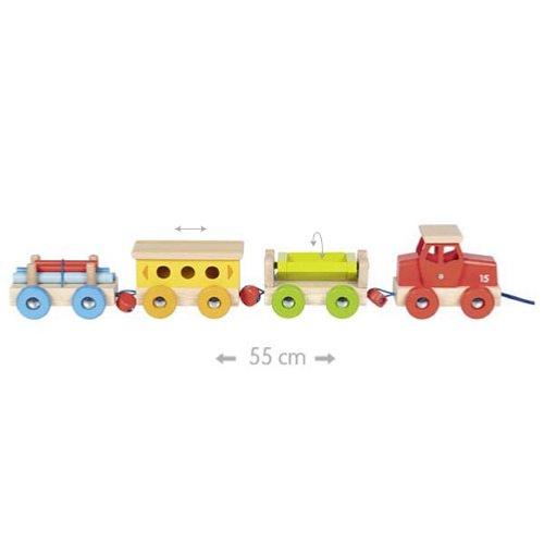 Superbe train de 55 cm de long composé d'une locomotive et de trois wagons qui s'attachent ou se détachent grâce à des perles en bois à fixer à des anneaux en élastique.